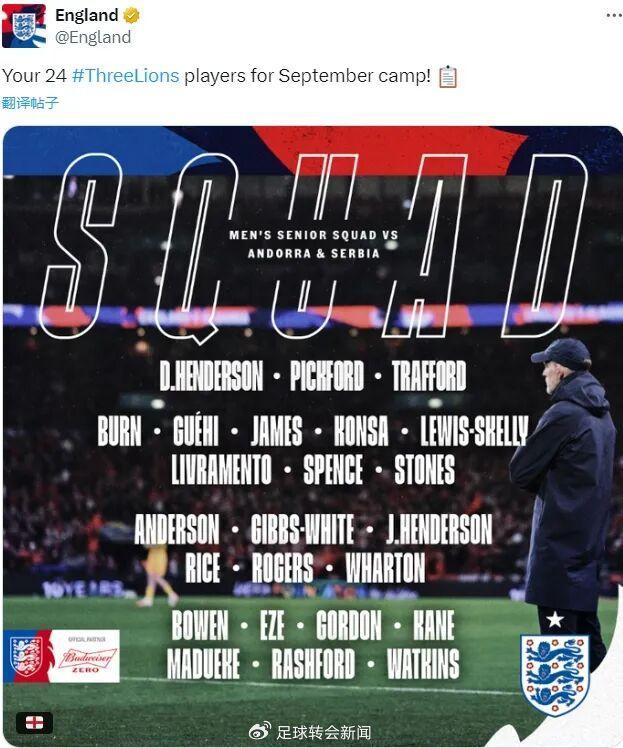 官方:斯凯利、赖斯、埃泽和马杜埃凯入选了最新一期英格兰国家队,以备战对安道尔和塞尔维亚的世预赛。