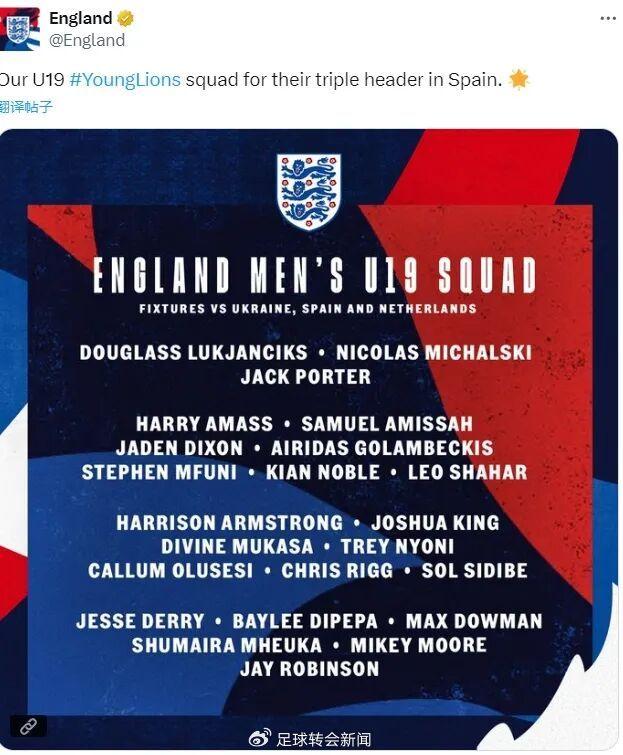 杰克-波特和道曼入选了英格兰u19大名单。